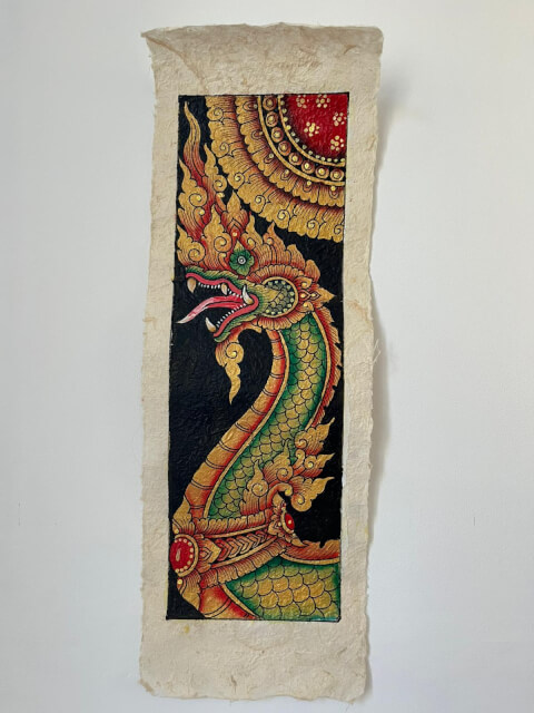 Peinture de dragon faite à la main sur du papier de mûrier traditionnel de Luang Prabang. Chaque pièce est unique, réalisée avec soin par un artisan local — parfaite pour offrir ou décorer votre intérieur.